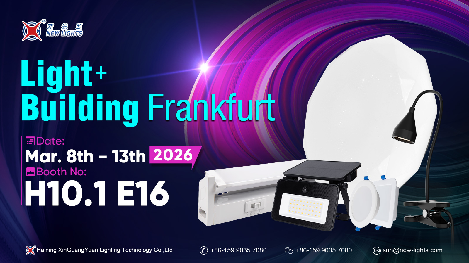 Haining Xin Guang Yuan Lighting Technology Co., Ltd sa zúčastní na medzinárodnej výstave osvetlenia v nemeckom Frankfurte od r. 8. až 13. marca 2026 . Spoločnosť bude vystavovať o Stánok H10.1 E16 . Počas výstavy Haining Xin Guang Yuan Lighting Technology Co., Ltd predstaví svoje najnovšie svetelné technológie a produktové riešenia a zapojí sa do hĺbkových výmen s odborníkmi z odvetvia a partnermi z celého sveta. Návštevníci sa môžu zastaviť v stánku na diskusie a možnosti spolupráce.